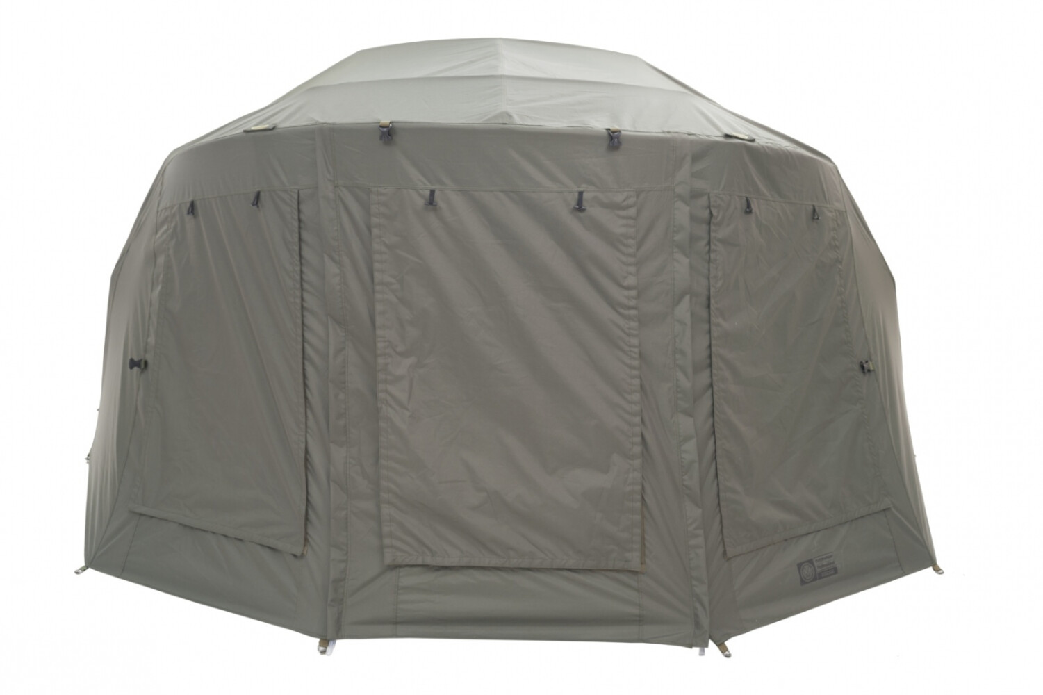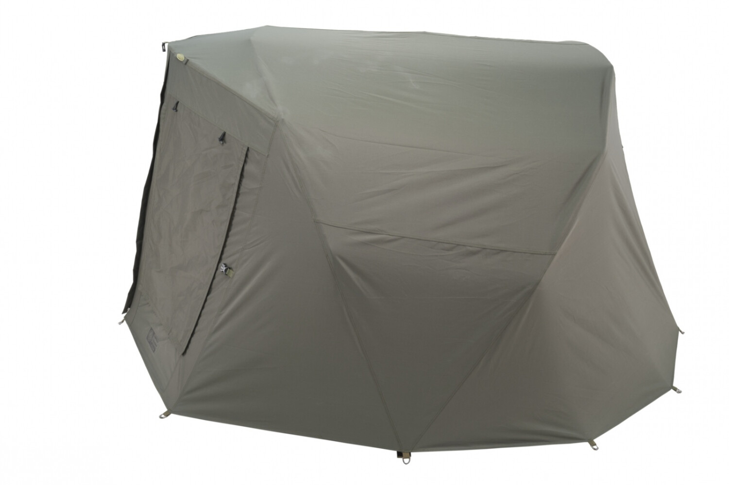 Narzuta na namiot Professional Bivvy. Narzuta jest wykonana z tego samego materiału co namiot. Trzy pełnowymiarowe okna składają się z trzech warstw z rzepem 25 mm z przodu i dwóch warstw z rzepem 50 mm z tyłu, które dopasowują się do kształtu i konturu okienek do namiotu. W standardzie dostępne są 4 uchwyty na wędki na rzepy i wytrzymałe zamki błyskawiczne z przywieszkami Easy Grip. Narzuta pomaga wyeliminować kondensację, zwiększa komfort termiczny i zapewnia jeszcze większą stabilność namiotu przy ekstremalnym wietrze.